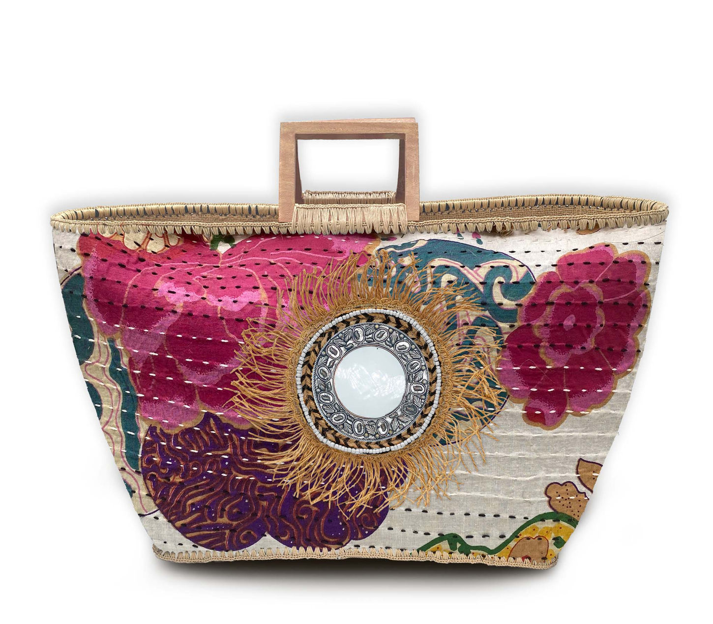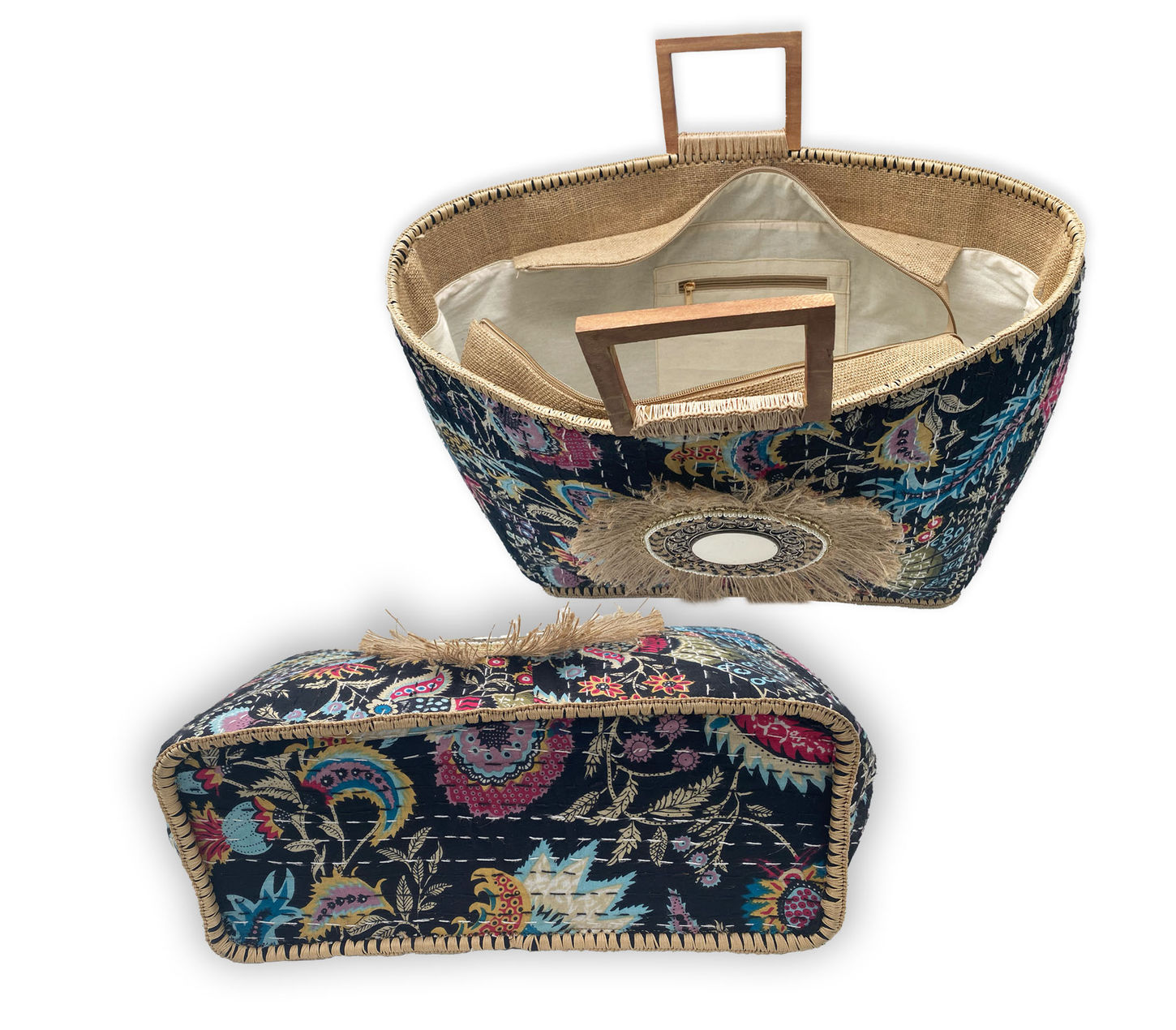 Katami is a collection of tote and basket-style bags crafted from artisanal quilted fabric featuring a delicate vertical line embroidery that adds texture and authenticity.