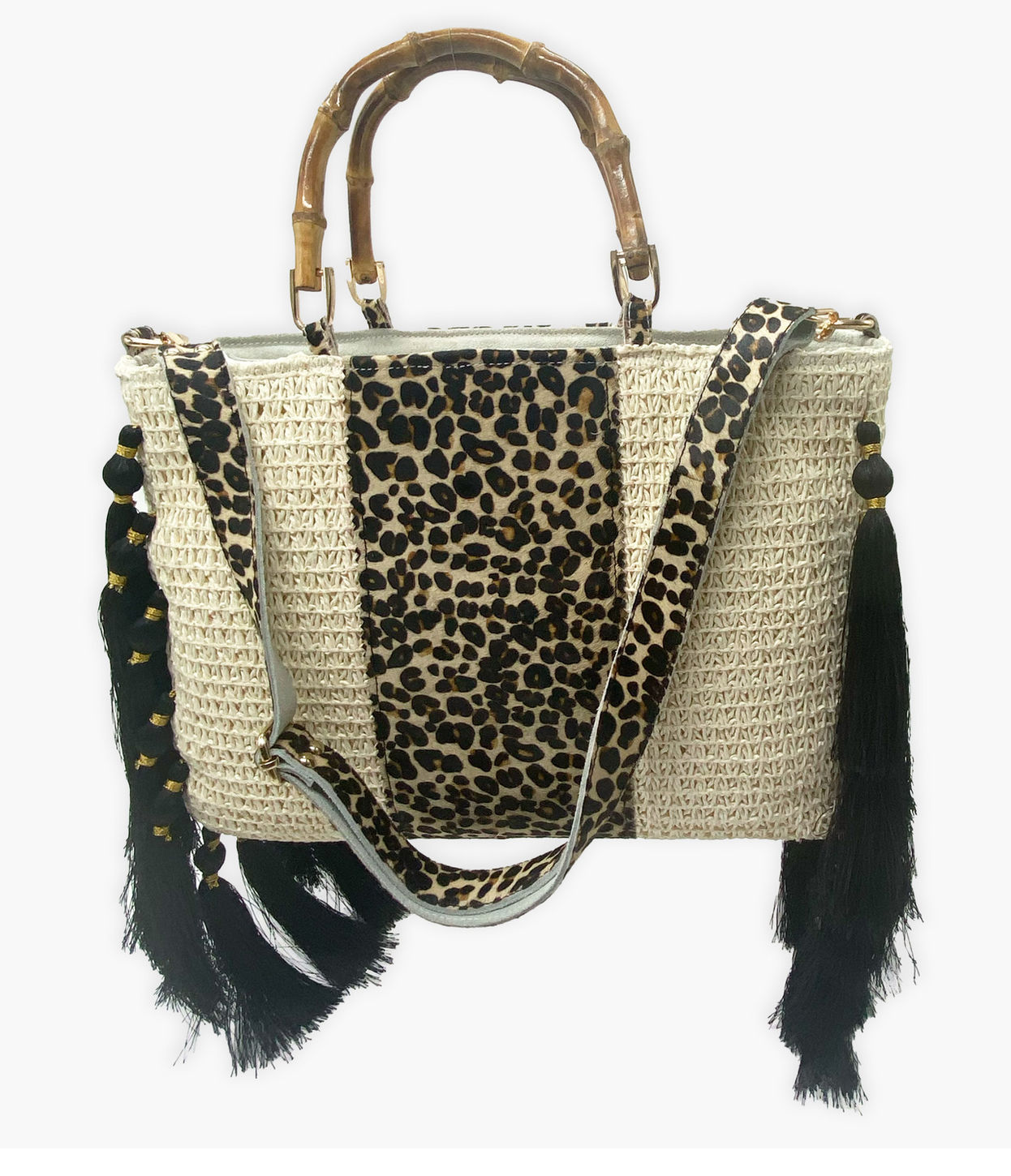 Limited-edition tote bags crafted in woven natural raffia fabric, combined with animal-print leather panels that create a striking contrast between the organic and the wild. The use of animal-print leather adds a distinctive, safari-inspired touch while maintaining the brand’s signature artisanal aesthetic.