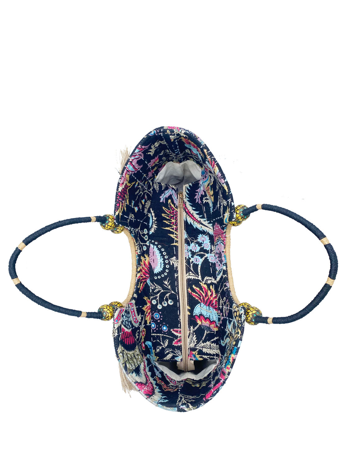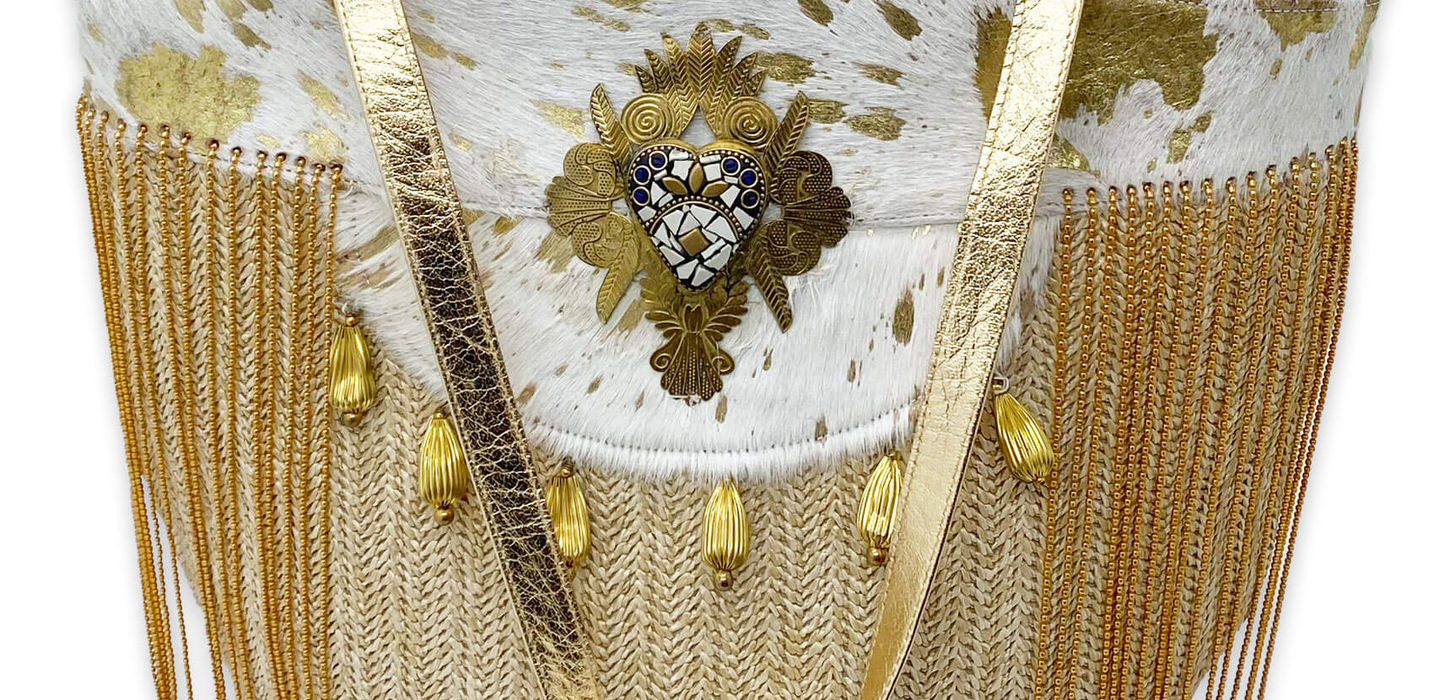 The design is enhanced with unbrushed natural raffia fringes, adding movement and lightness, and a decorative front trim that combines different ornamental fittings and handcrafted techniques.