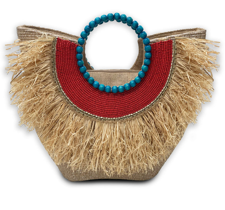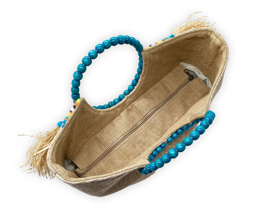 The circular handle made of lacquered wooden beads in a turquoise tone creates a bold contrast with both the palm texture and the natural raffia fringe.