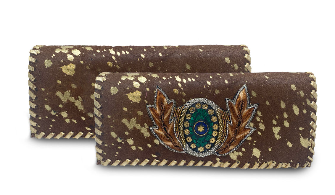 Moonmona is a rectangular clutch designed to be carried by hand. It is crafted from the same hair-on leather with gold-flecked texture that defines the collection. The entire piece —including the flap— is finished with an artisanal perimeter stitch that reinforces the structure and adds a distinctive handcrafted touch.