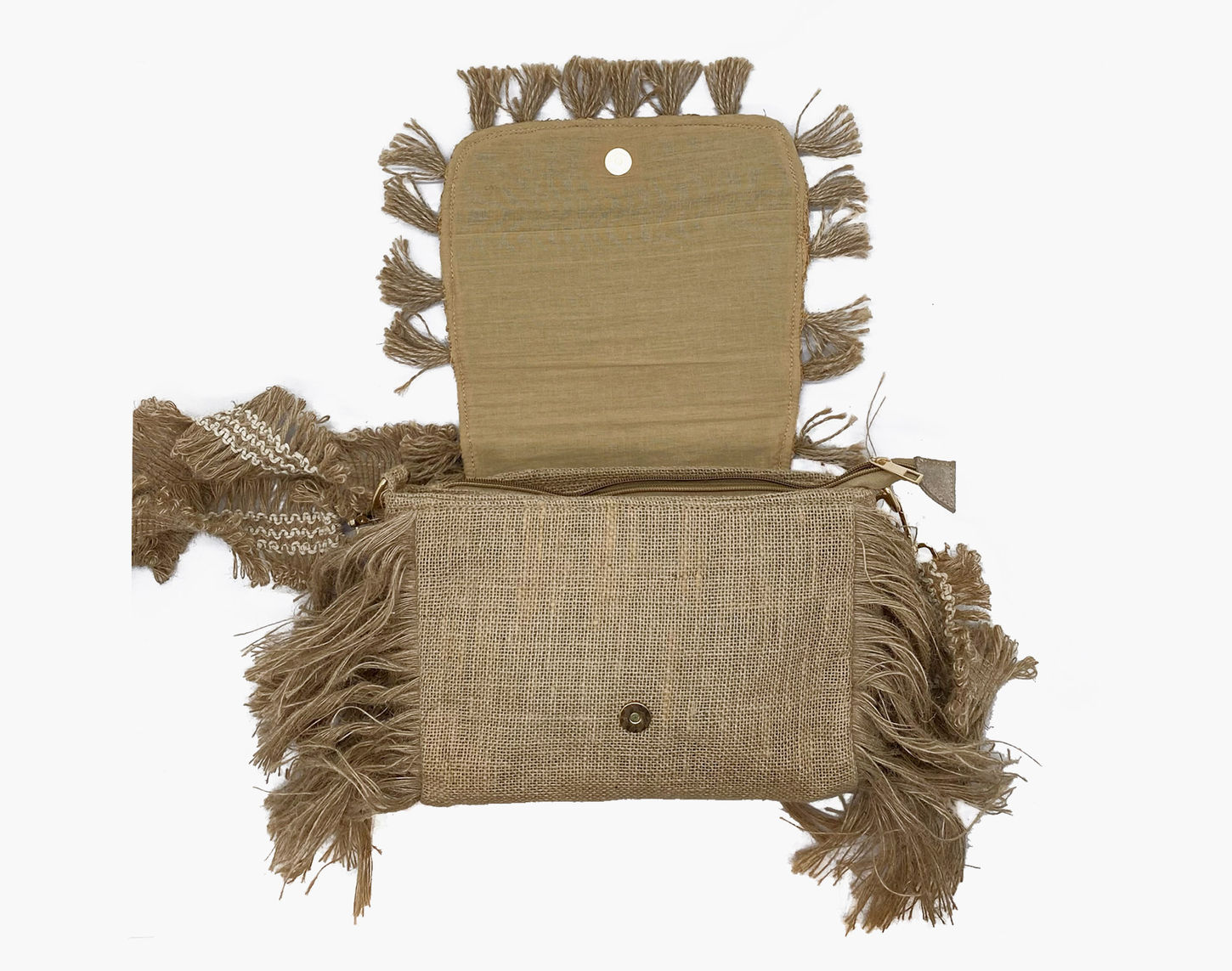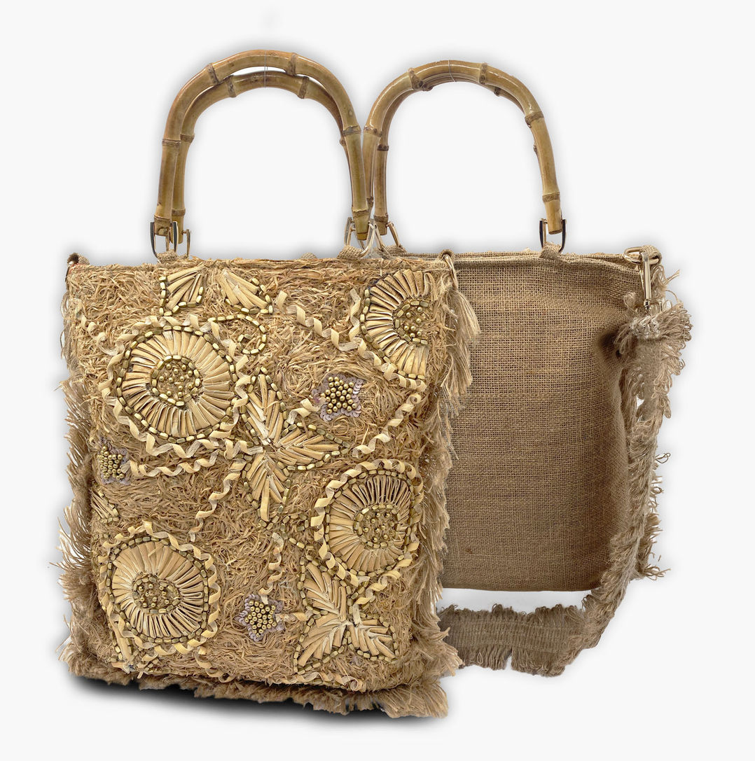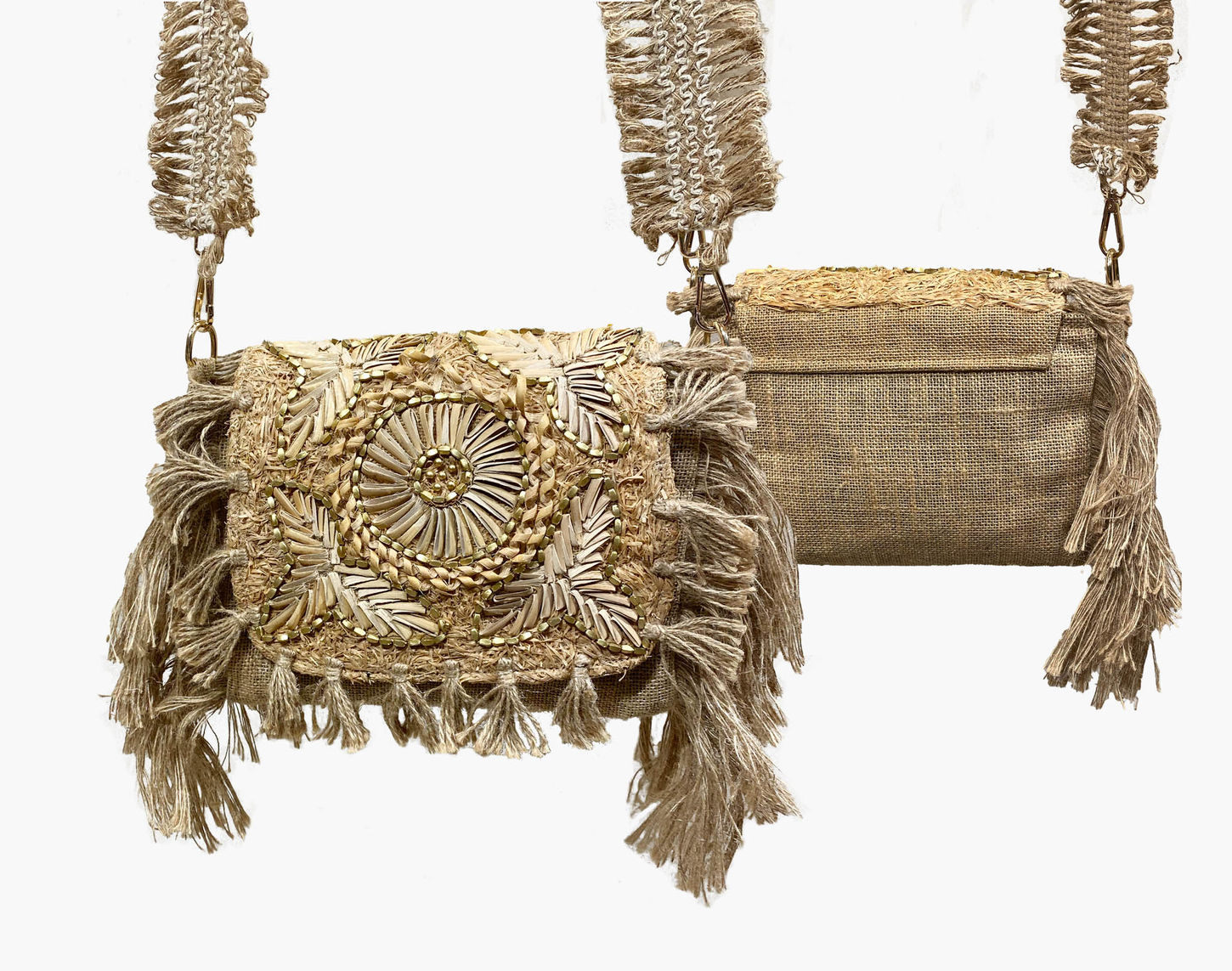 A collection crafted entirely from jute, enhanced with a distinctive grass-like texture that adds depth and an organic, tactile feel. The designs highlight natural fibers through raw fringes, layered weaves, and tone-on-tone embellishments that preserve the earthy, authentic character of the material.