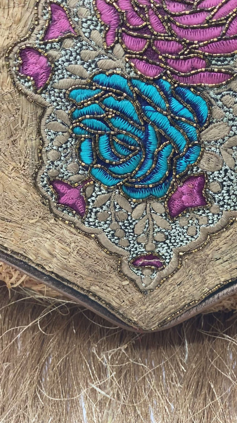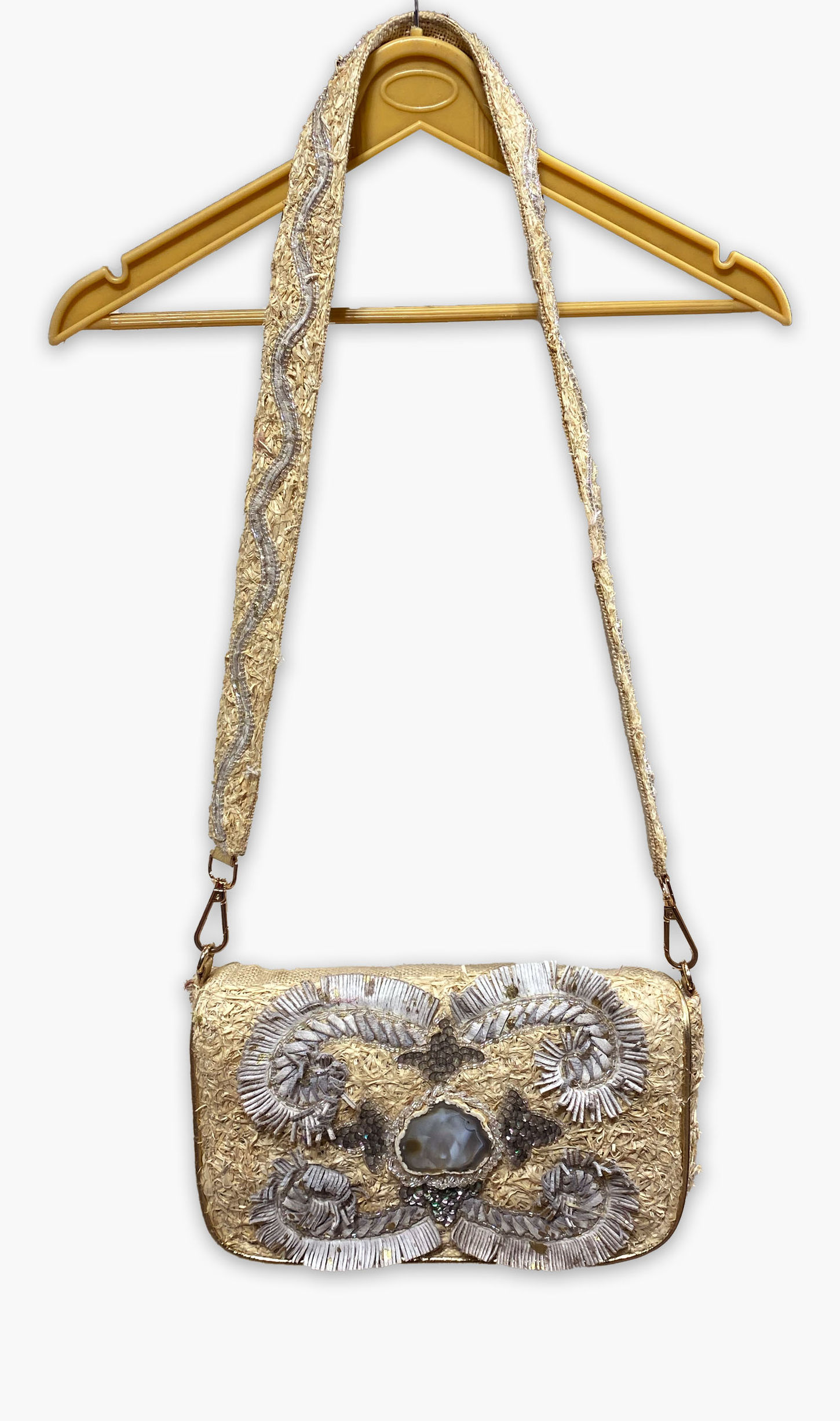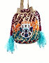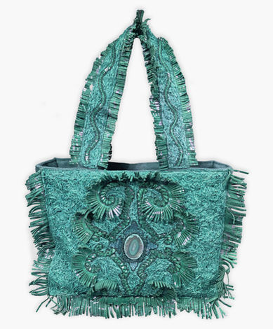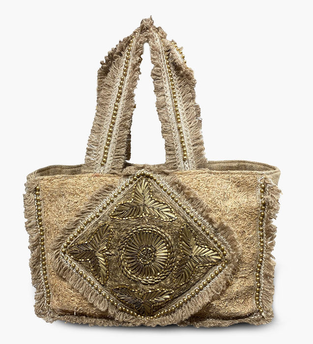 Fringed edges and decorated handles enhance the boho-inspired look, while the central stone-like appliqué adds a unique, artisanal focal point.