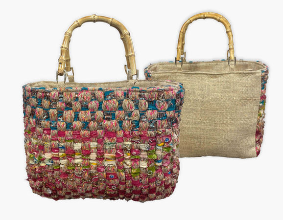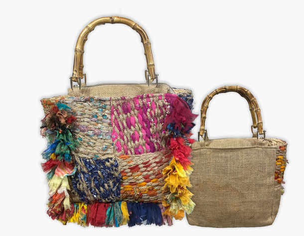 Each bag is built on a natural jute base and elevated with hand-woven panels that blend multiple yarns, ribbons, and fabric strips, creating bold color blocks and tactile, dimensional surfaces.
