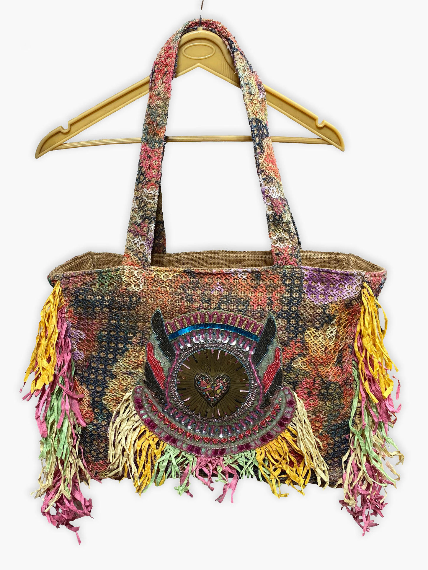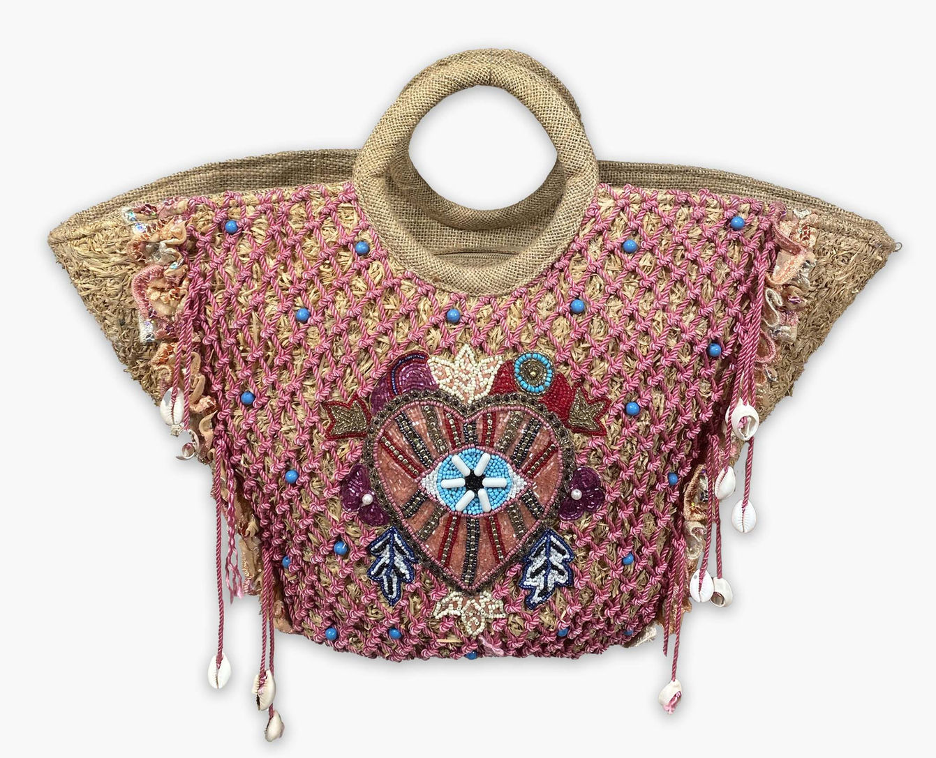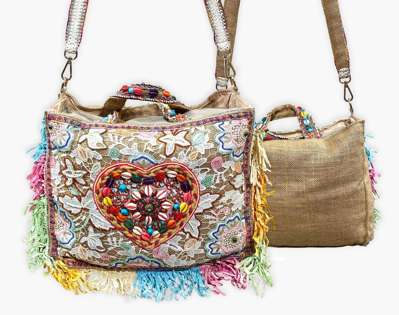 A vibrant, handcrafted collection built on natural jute bases in tote-bag silhouettes. Each design blends artisanal techniques with decorative elements that give the pieces a distinctive character: intricate embroidery, shells, beads, heart motifs, protective eyes, and richly woven panels in bold colors. The handles and edges are enhanced with fringes, ribbons, and braided trims that reinforce the collection’s expressive, boho spirit.