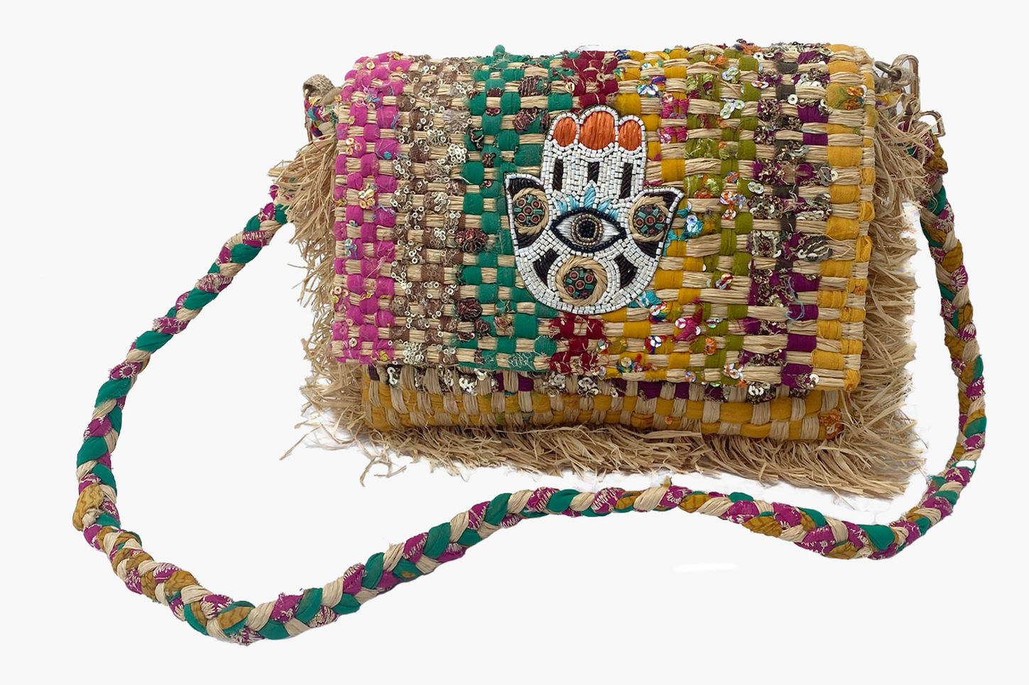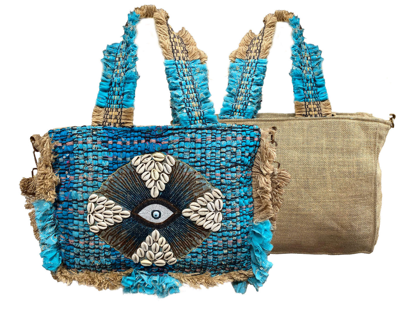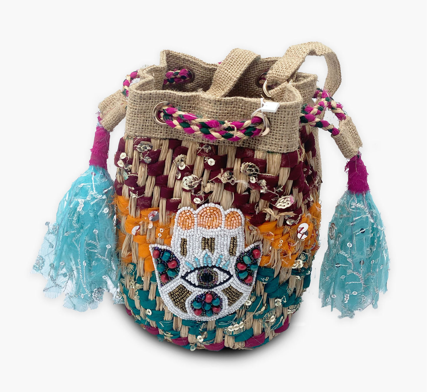 A vibrant, handcrafted collection built on natural jute bases in tote-bag silhouettes. Each design blends artisanal techniques with decorative elements that give the pieces a distinctive character: intricate embroidery, shells, beads, heart motifs, protective eyes, and richly woven panels in bold colors. The handles and edges are enhanced with fringes, ribbons, and braided trims that reinforce the collection’s expressive, boho spirit.