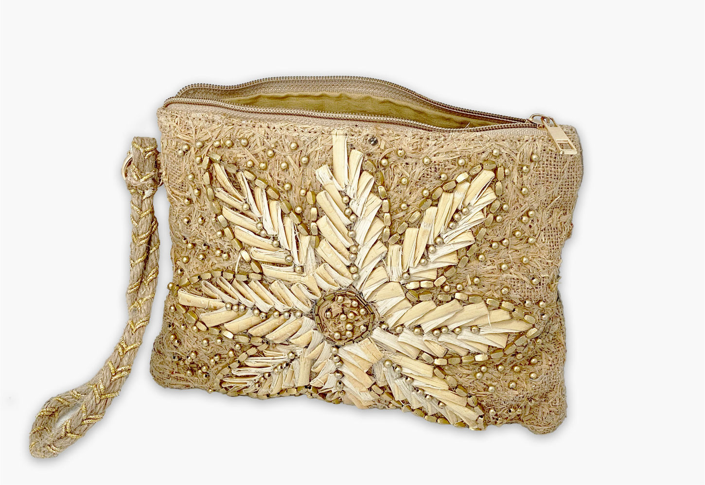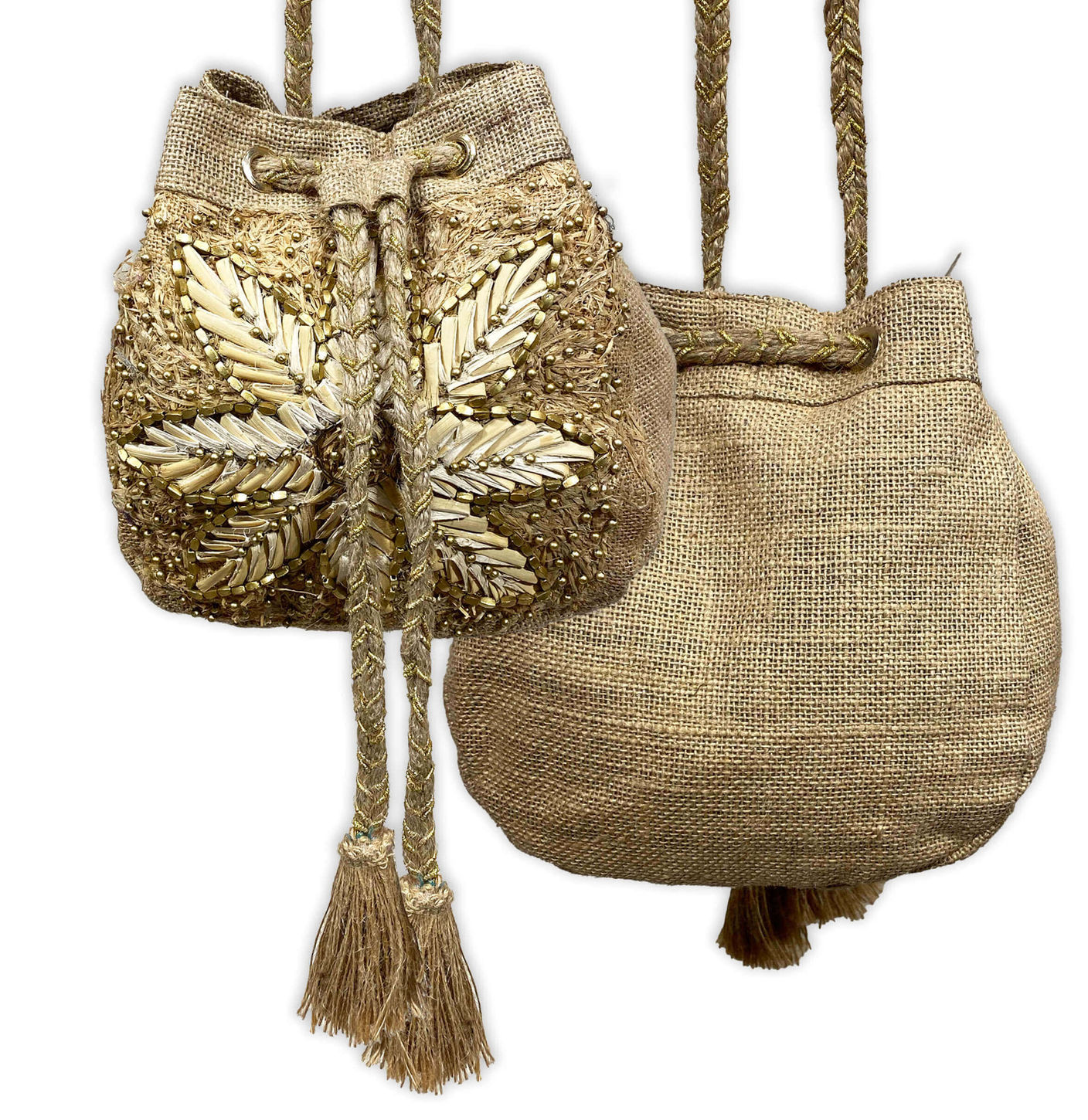 A collection crafted from jute and elevated through a full dyed finish that gives each piece a rich, saturated tone. The bags feature intricate tonal embellishments, layered appliqués, and ornate beadwork that create a sculptural, textured surface.